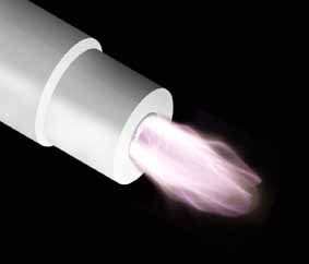 滑動(dòng)電弧放電等離子體通常應(yīng)用于材料的表面處理和有毒廢物清除和裂解。下圖中的滑動(dòng)電弧由一對(duì)像圖中所示的延伸弧形電極構(gòu)成。電源在兩電極上施加高壓引起電極間流動(dòng)的氣體在電極最窄部分電擊穿。一旦擊穿發(fā)生電源就以中等電壓提供足以產(chǎn)生強(qiáng)力電弧的大電流,電弧在電極的半橢圓形表面上向右膨脹,不斷伸長(zhǎng)直到不能維持為止。電弧熄滅后重新起弧,周而復(fù)始。其視覺觀看滑動(dòng)電弧放電等離子體就像火焰一般,但其平均溫度卻比較低即使將餐巾紙放在等離子體焰上也不會(huì)燃燒。它又被稱為“索梯”(Jacog's Ladder)?;瑒?dòng)電弧放電產(chǎn)生的低溫等離子體為脈沖噴射,但可以得到比較寬的噴射式低溫等離子體炬(plasma torch)。